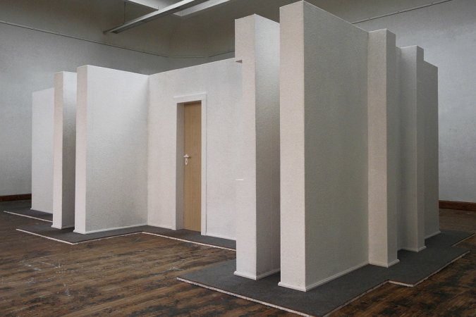 Objekt: Styropor per Hand geschnitzt und Überschliffen / Installation: Dachlatten, Spannplatte, Lack, glatte Tapete (u.a.)