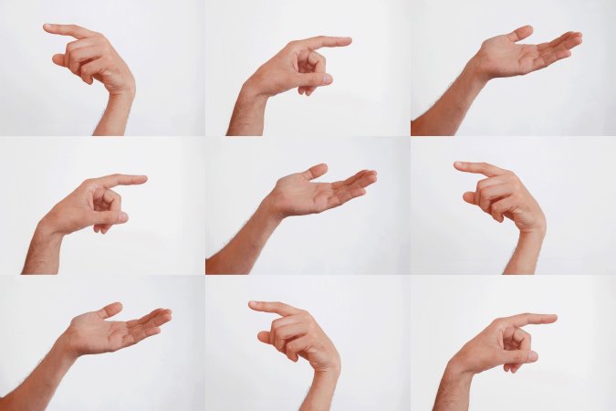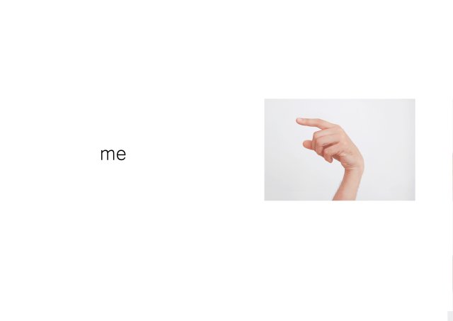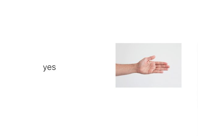 Parallel zu den Objekten aus der Reihe WORDS+OBJECTS entstanden Fotocollagen, die die Sprache der Objekte in lesbare Gesten übersetzen. Die Collagen bestehen aus einfachen Permutationen: der Titel eines Objekts wird mittels Handgesten in einer Zeile in mehreren Bildern “Wort für Wort” widergegeben. Die Reihenfolge der ersten Zeile wird in den drauf folgenden Zeilen vertauscht. Auf diese Weise entstehen Fotocollagen, die zugleich als Bild betrachtet, wie als Text gelesen werden können.