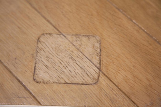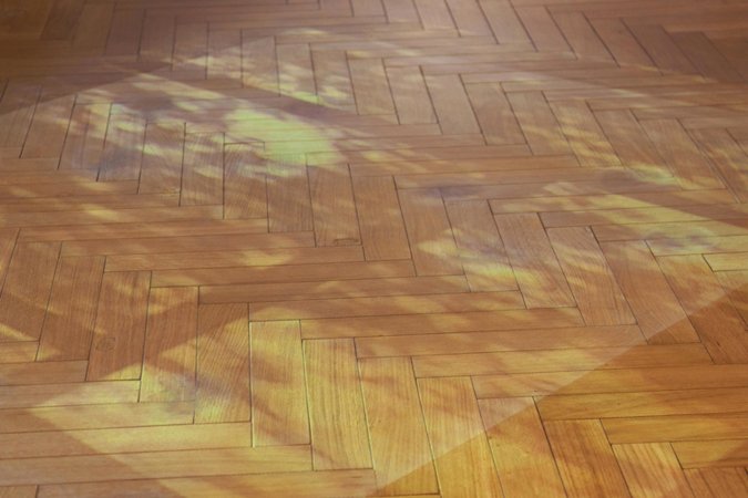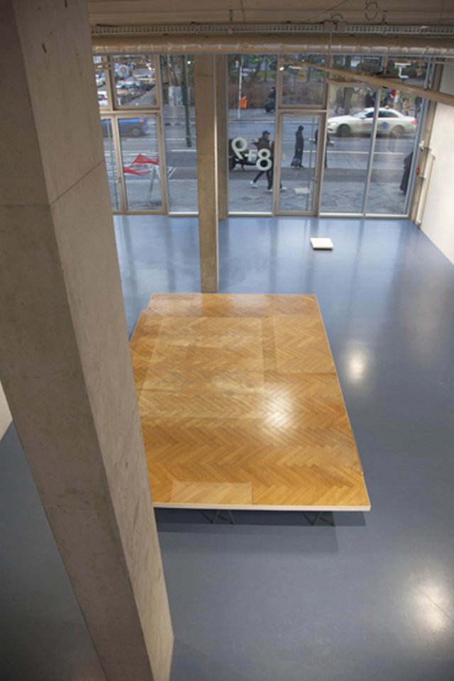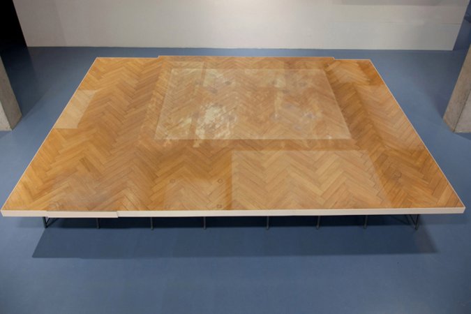 Aus der Erinnerung wird der Fußboden eines Familien-Wohnzimmers (Wohnzimmer der Großmutter) so genau wie möglich nachgebaut, mit allen Nutzungspuren, die Menschen und Möbel darauf hinterlassen haben. Während Menschen, Möbel, Zimmer und Wände verschwunden sind, fällt warmes Licht durch ein ebenfalls verschwundenes Fenster. Oben: Installation im Ausstellungsraum mit bewegter Projektion des langsam wandernden Sonnenlichtes / Darunter: Gesamtansicht und Detail: ins Parket eingearbeitete Spuren.
