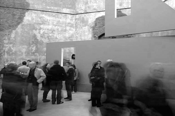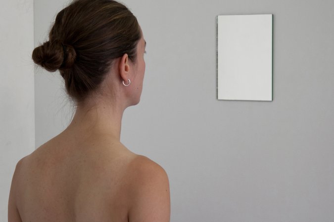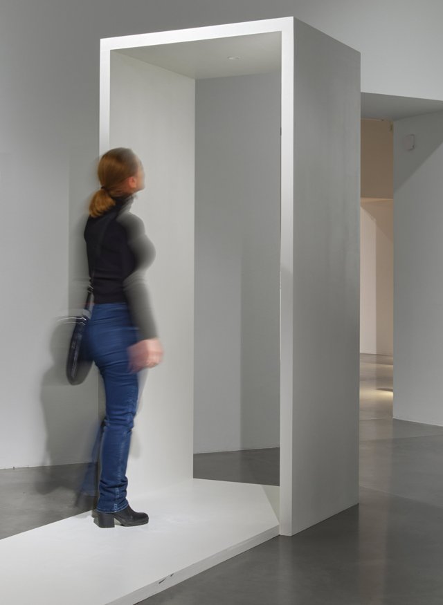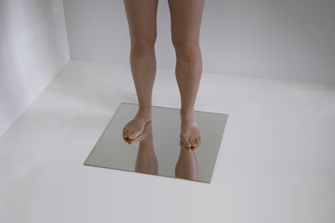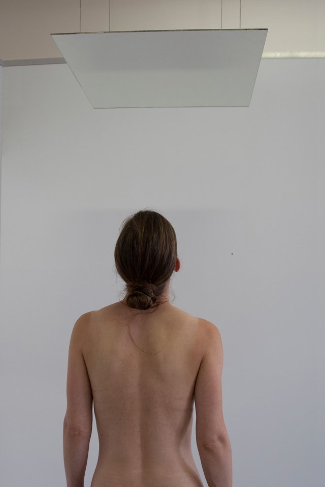 In einem großen leeren Raum befindet sich eine Umkleidekabine. Darin die folgende Handlungsanweisung: “Geh allein in die Kabine. Verschließe die Tür. Zieh dich aus. Betrachte dich erst in dem ersten, dann dem zweiten, dann dem dritten und dann dem vierten Spiegel so lange du möchtest (mindesten 1 Minute lang). Ziehe dich wieder an. Die Bestandsaufnahme ist abgeschlossen.” Oben: Außenansicht der Umkleidekabine / Darunter: Innenraum mit Spiegeln. Jeder der vier Spiegel ist in einem anderen Quadranten der Kammer montiert. Spiegel 1 zeigt einen vertrauten Anblick, das Gesicht von vorne (ähnlich des Ausschnittes bei einem Passbild). Spiegel 2 zeigt eine ungewöhnliche Unterperspektive bei der alles, Gesicht und Gliedmassen, mit der Zeit rot zu werden und herabzuhängen scheint; man nähert sich dem Boden an. Spiegel 3 zeigt genau das Gegenteil, einen Menschen der nach oben strebt, zunehmend angestrengt und wie künstlich geglättet wirkend. Spiegel 4 (nicht abgebildet) zeigt den relative vertrauten Anblick von Vorne, diesmal vom Bauchnabel bis Scheitel. Nachdem man sich in Spiegel 1, 2 und 3 gesehen hat, wirkt der Anblick nun allerdings neu und unvertraut.