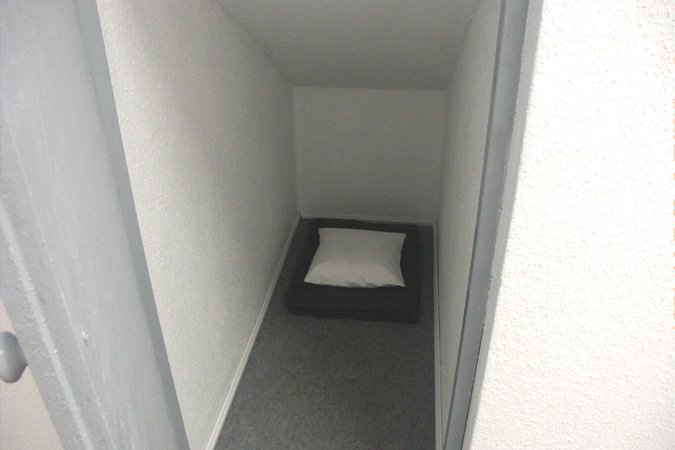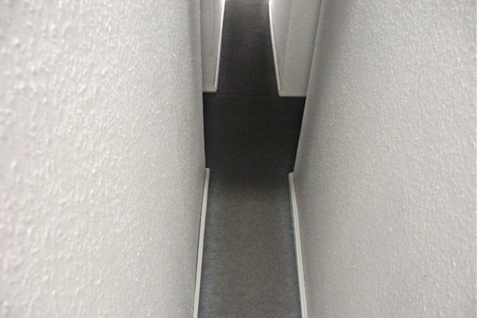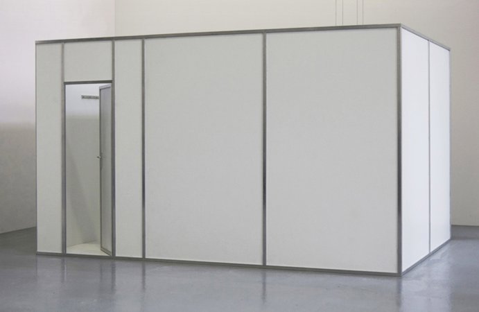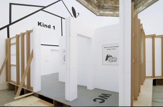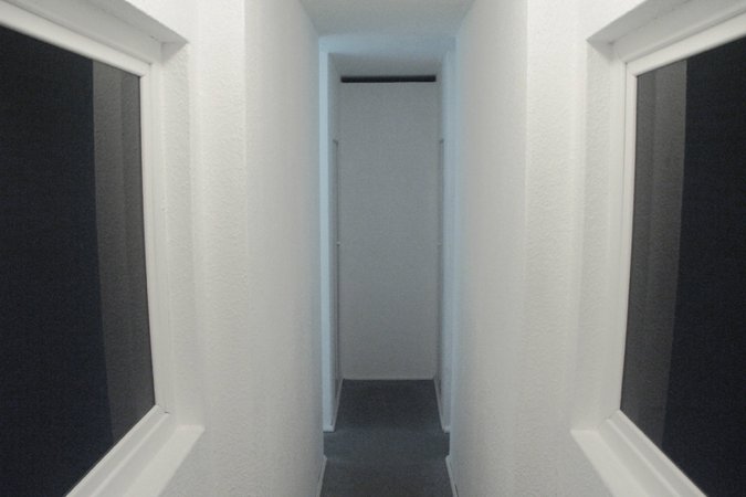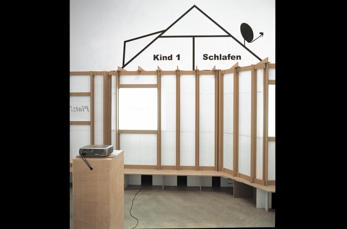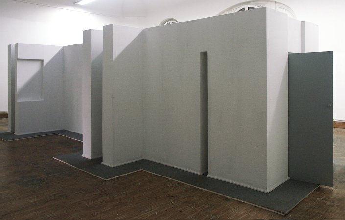 Die Arbeit „Heim 03/Narrow house“ (Skizze: 2001/Realisierung: 2003) stellt eine Art verräumlichtes Psychogramm dar, die nervöse Unruhe eines Menschen, die sich in Form einer zu schmalen Wohnung ohne wirklichen Aufenthaltraum materialisiert hat. Der Aufbau erinnert an eine reale Wohnung, mit Wänden, Raufaser-Tapete, Türen, Teppichboden etc. – allerdings merkwürdig verfremdet. Die “Wohnung” besteht im Grunde genommen nur aus Raumanschnitten und einem einzigen langen, schmalen Korridor im Inneren, der wiederum in noch schmalere Korridore und Seitenkammern mündet. Einen Raum zum Verweilen gibt es nicht. Entlang der zentralen Achse ist zudem alles symmetrisch gespiegelt. Die Ausstellungsbesucher*innen stoßen auf Garderobennischen, die zu schmal sind um sie zu benutzen, auf Toilettentüren, die links und rechts des Mittelganges symmetrisch klemmen und quietschen, oder auf schwarze Fenster, die – obwohl im Innenraum befindlich – wie von außen zu sehen sind. Das räumliche Arrangement wirkt beklemmend auf seine Besucher*innen, bringt diese aber immer wieder auch zum Lachen.