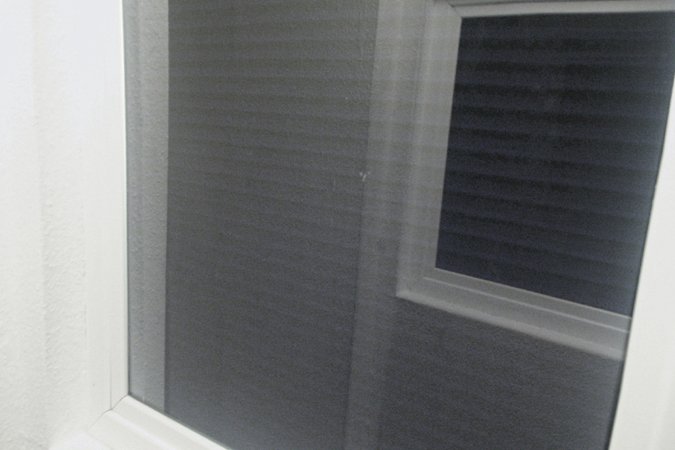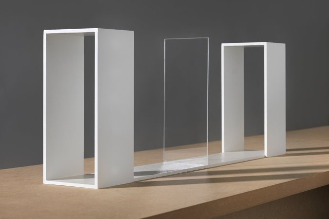 Die unterschiedlichen Arbeiten kreisen um den Gedanken des Unzugänglichen, des Verborgenen: Was befindet sich hinter dem dunkelgrau mattierten Glas? Ein Raum? Warum ist er nicht zu betreten? Und was oder wer könnte sich darin befinden? Während die Arbeiten UNBEFRIEDIGENDE SITUATION (links/oben) und KAUM BESSERE SITUATION (Mitte) eine Mischung aus installativ gebautem Raum und dreidimensionalem “Bild” darstellen, erlaubt die Arbeit UNKLARE SITUATION FÜR ZWEI PERSONEN (mit hellgrau mattierter, leicht transparenter Glastrennwand) ein reales Betreten von beiden Seiten durch zwei Personen; unklar bleibt in diesem Fall kein Raum, sondern das reale Gegenüber.
