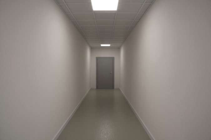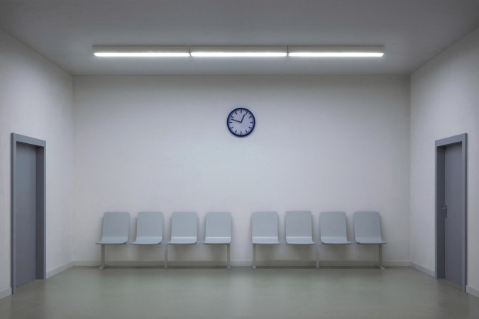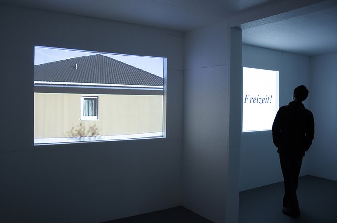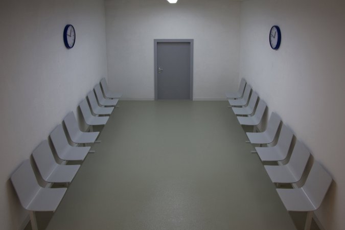 Ein langer Korridor führt in einen Warteraum, darin nichts außer einer Uhr, sowie Warteplätze und andere Wartende. Die Ausstellungsbesucher*innen nehmen Platz und verweilen eine beliebige Zeitdauer, bis sie den Warteraum durch einen ebenso langen Korridor auf der anderen Seite des Raumes verlassen. (Version oben: Warteraum ohne Korridor / Version darunter: Langer Korridor mit Warteraum.)