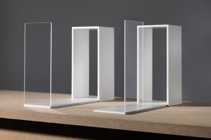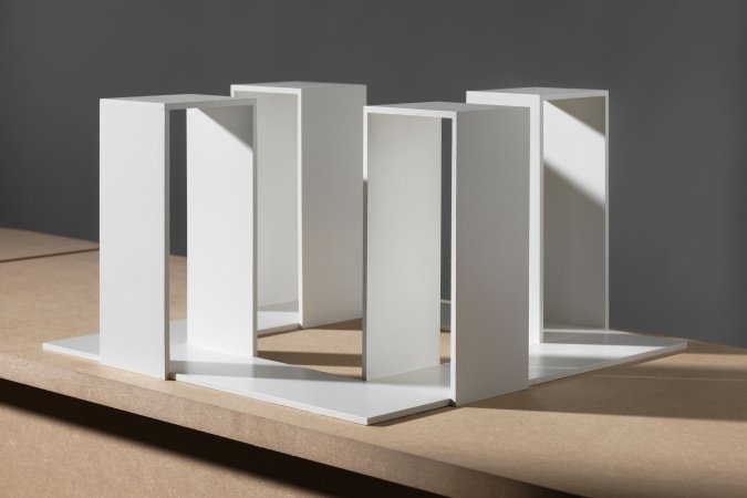 Die Arbeiten aus der Reihe „Words + Objects“ basieren auf einem einzelnen Element, das nur leicht variiert wird (ohne Wand, mit Wand, mit Wand seitlich, mit transparenter Wand oder massiver Wand). Die einzelnen Elemente werden verschieden kombiniert. Sie formieren Zweier, Dreier oder Vierergruppen. Formal erinnern sie an die U.S.Amerikanische Minimalkunst der 1960er und 70er Jahre. Diese gab sich bewusst industriell und wollte reine Form ohne Aussage sein. In ironischer Bezugnahme kehren die Objekt-Formationen aus „Words + Objects“ diesen Gedanken um: Sie ergeben formal, wie ganz konkret, im Sinn von Wörtern, bewusst „lesbare Formationen“ die ebenso als Relationen zwischen Objekten wie zwischen Menschen interpretiert werden könnten. (Abbildungen oben: Ausstellungsansichten “ein kleines Stück Unsichtbarkeit”, 2021 / Acht Konstellationen aus Elementen auf MDF Sockeln / zugehörige Bild-Gedicht Collagen an Wand.)