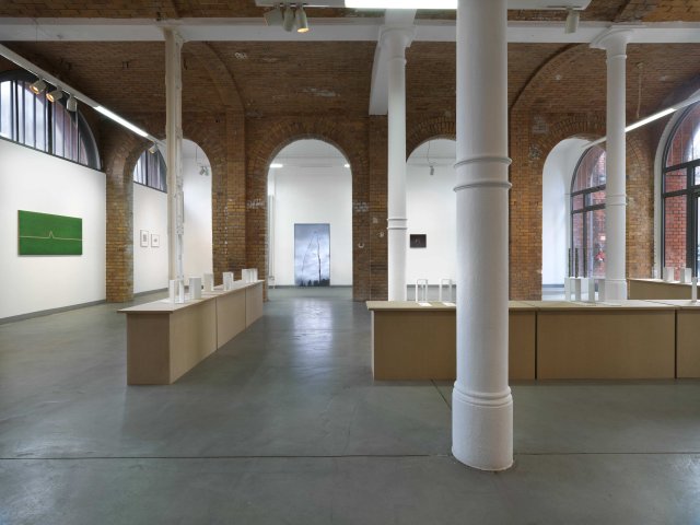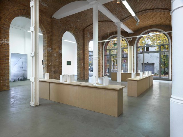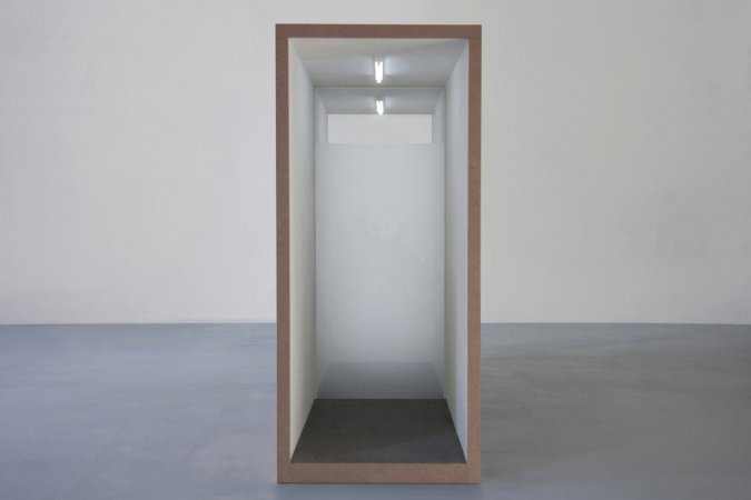 The works from the series “Words + Objects” are based on a single element that is only slightly varied (without wall / with wall at the end / with wall on the side / with transparent wall / with solid wall). The individual elements are combined in different ways, forming arrangements of two, three or four elements. Formally the pieces remind of the U.S.American minimal art of the 1960s and 70s, which deliberately aimed to look industrial and wanted to be pure form without statement or possibility of interpretation. In ironic reference, the pieces created within “Words + Objects” reverse this thought. The formations they create are meant to be read: formally as well as literally, with the help of an index displayed in the exhibition. They may be interpreted, too: as relations between objects as well as between people.